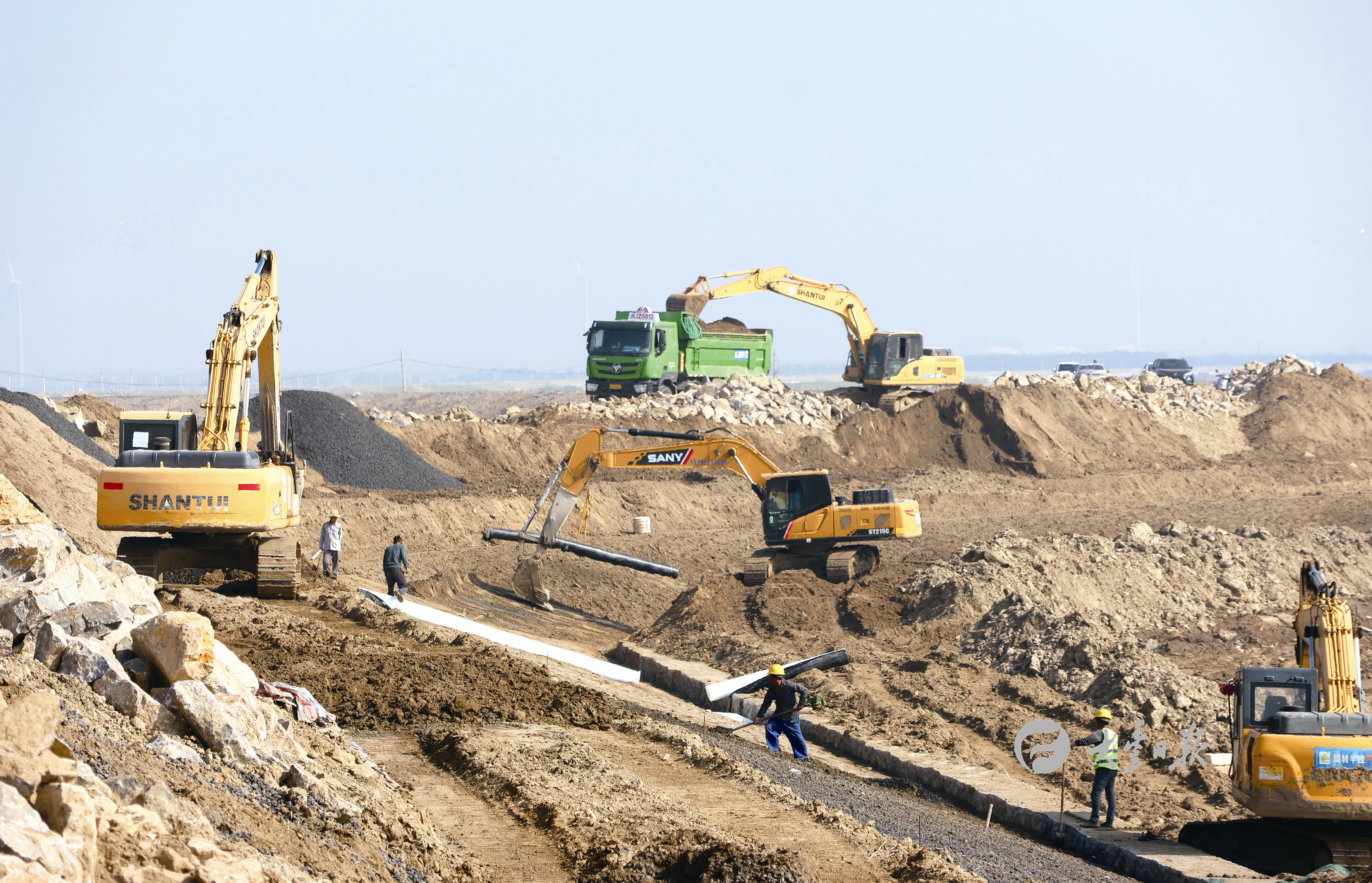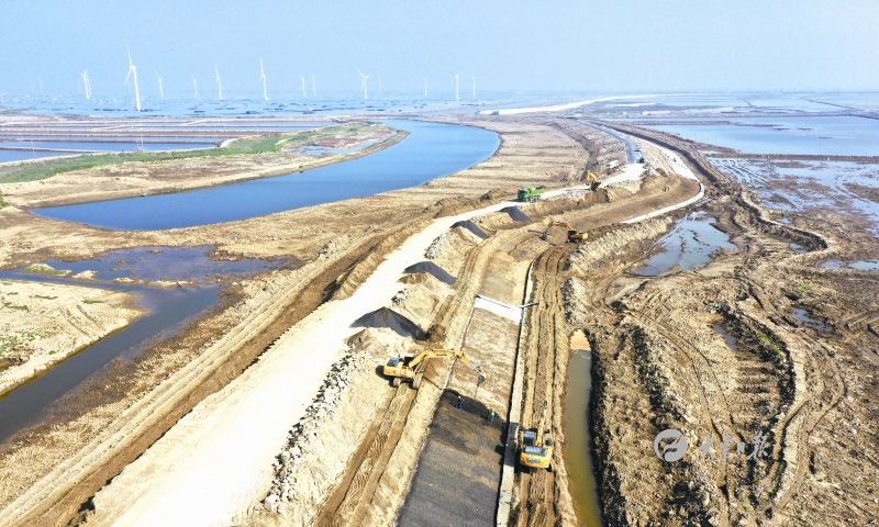 6月8日,大丰竹港闸北侧,施工人员在新王、竹海岸带综合整治工程进行安全防护、绿化等扫尾工作。经了解,该工程北止王港新闸、南止竹港新闸,计划投资9900万元,在滩涂上修筑5.27公里路段,这也是连接盐城旅游1号线重要节点。今年5月1日该线路开通后,采取边通车边扫尾的方法,让市民和游客尽快享受沿海旅游公路通车带来的便捷。