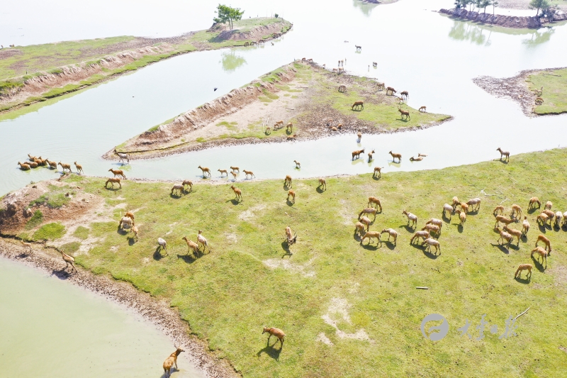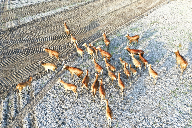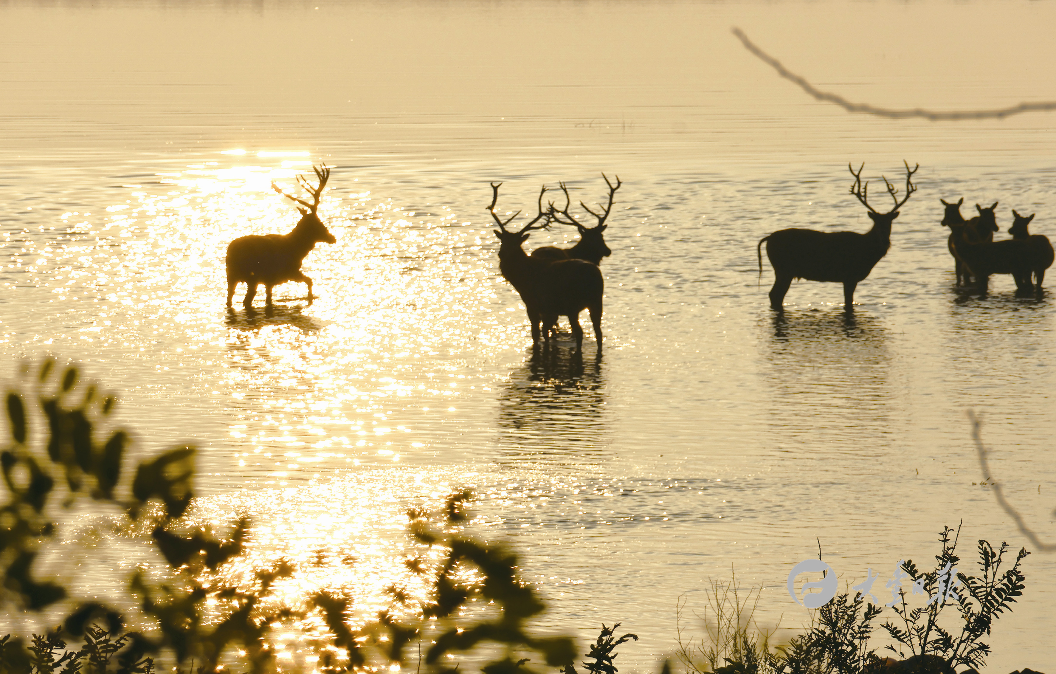 近日,大丰黄海滩涂湿地上,野生麋鹿在晨光中觅食戏水,悠然自得。近年来,黄海湿地生态环境逐步改善,沿海居民对麋鹿的保护意识不断增强,滩涂湿地已成为野生麋鹿适宜生存的家园。