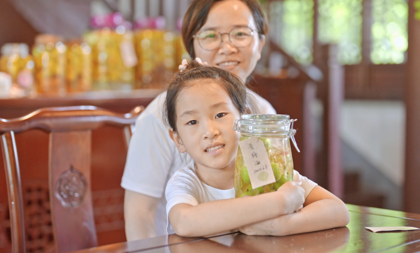采摘完青梅后,大家来到颂梅阁。在这里,专业的师傅向大家介绍了青梅酒的酿造过程。孩子们和家长一起动手,将青梅清洗干净,去除果蒂,然后加入适量的冰糖。接着,倒入50度的白酒,只见清澈的酒液与青梅、冰糖相互交融,散发出诱人的香气。