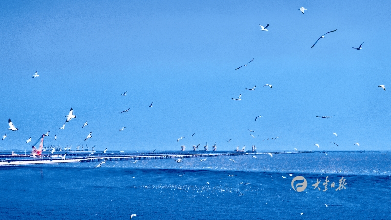 在大丰港二期码头海岸边,成群海鸥于蓝天碧海间肆意翱翔,与繁忙的码头设施交相辉映。这里,产业发展与生态保护并行不悖,数百只海鸥或振翅高飞,或在海面嬉戏觅食,展现出一幅灵动的生态图景。大丰港秉持绿色发展理念,让码头作业区成为海鸥等水鸟的栖息乐园,生动诠释了盐城沿海经济与自然生态的和谐共赢。