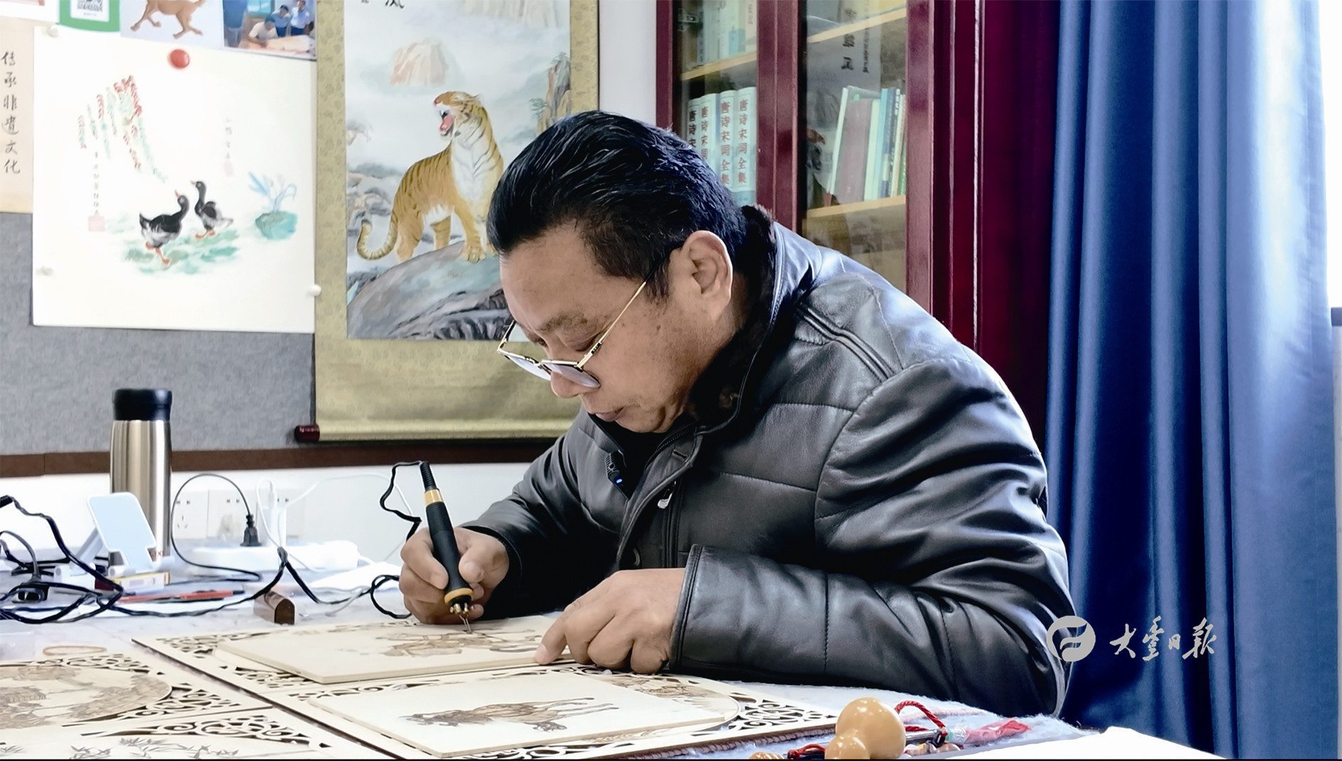 谈及烙画技艺,景保俊有着自己的独到见解:“烙画看似简单,实则讲究‘力度、温度、速度’这三个关键,缺一不可。”他解释道,温度决定烙痕的深浅,力度掌控线条的粗细,速度影响画面的质感,三者相互配合,才能烙出层次丰富、形神兼备的作品。为了让这门非遗技艺更好地传承下去,景保俊还将复杂的烙画技巧编成朗朗上口的顺口溜,走进校园、开设公益课堂,手把手传授给孩子们,让草堰烙画的火种在青少年心中生根发芽。