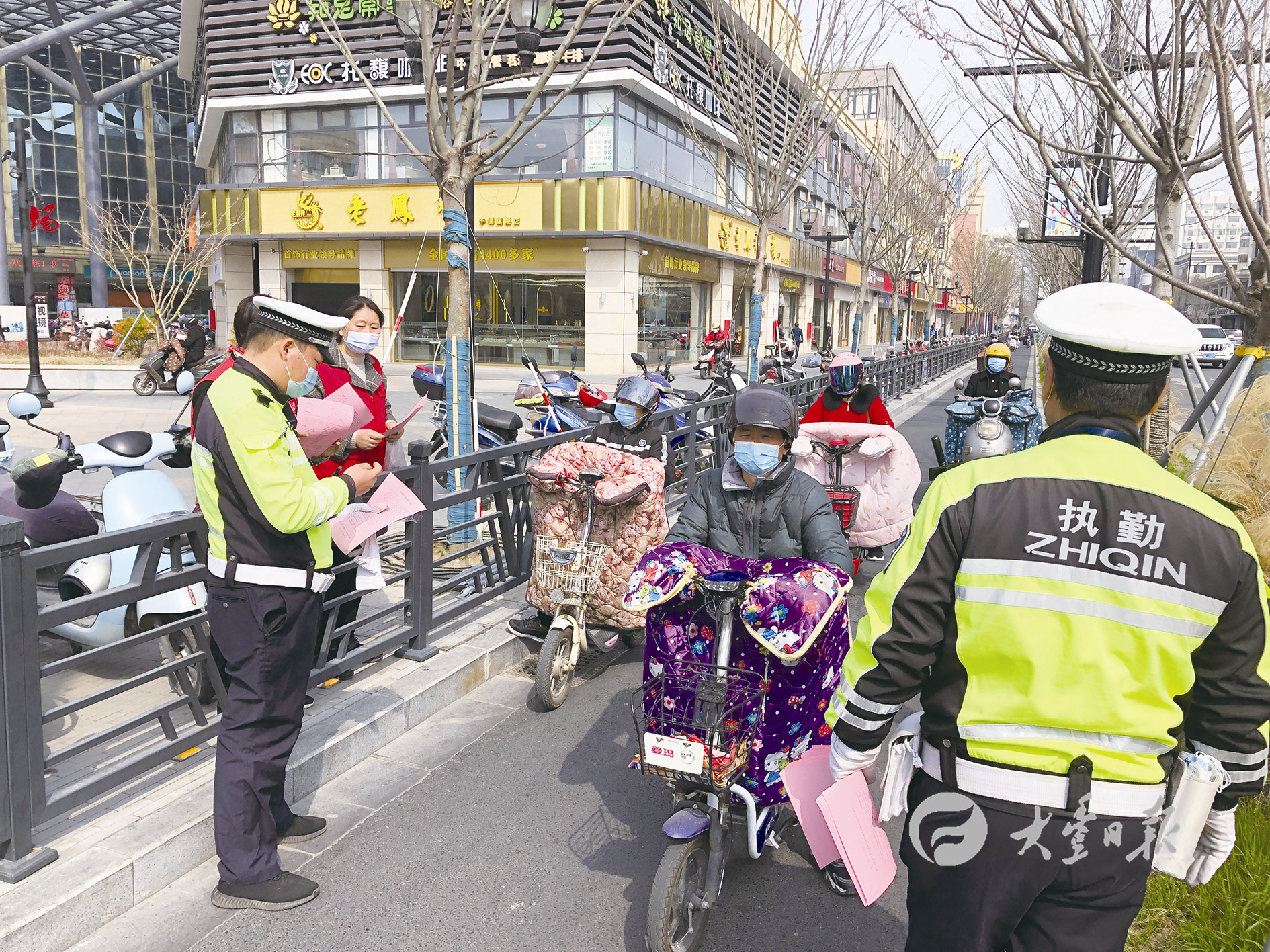 图为在城区健康路和人民路十字路口,多名交警向过往市民发放疫情防控宣传单,宣传戴口罩的益处。