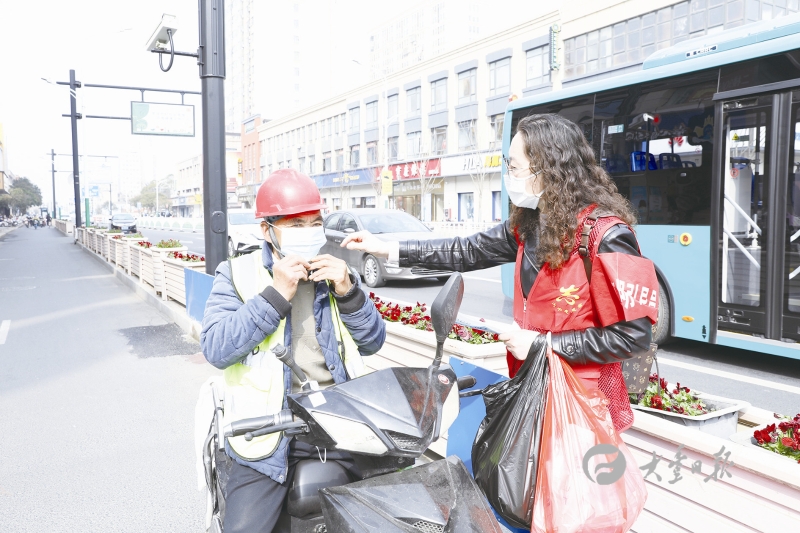 图为大中街道党员志愿者向未戴口罩的市民免费发放口罩,提醒广大群众戴口罩、勤洗手。