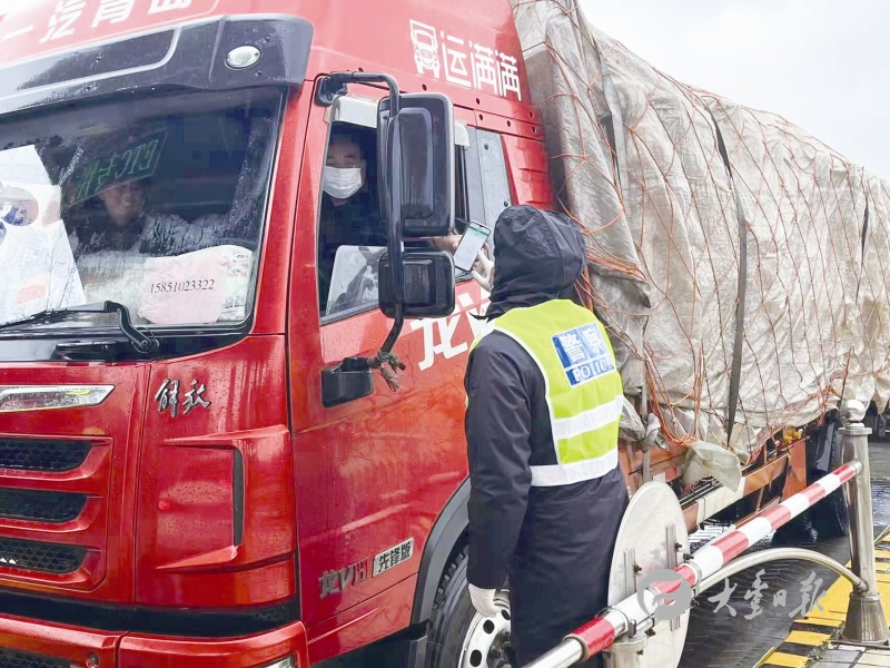 图为在大丰收费站(G15沈海高速出入口),交警有条不紊地对入境车辆及人员开展健康码、行程码查验以及体温测量等工作。