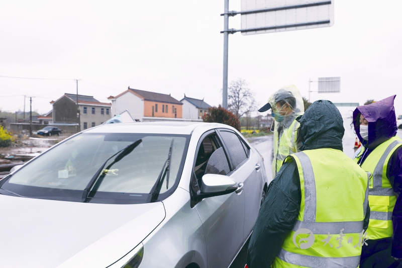 图为在白驹镇葛窑大桥卡口,该镇志愿者检查入境车辆驾乘人员健康码、行程码,全力构筑抵御病毒输入传播的坚强防线。