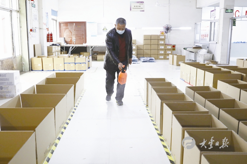 日前,盐城嘉华服饰有限公司仓库内,工作人员对包装箱进行消杀。