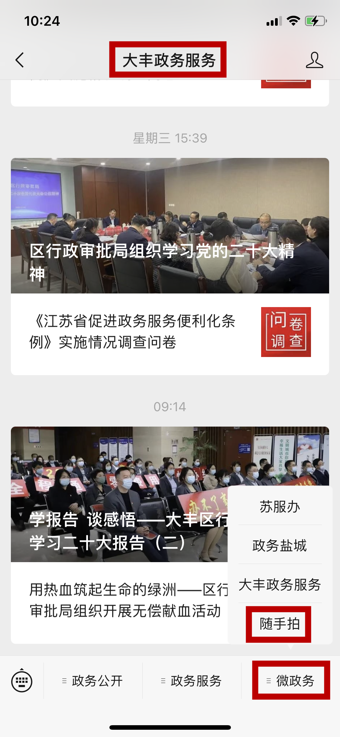 关注“大丰政务服务”微信公众号,下方子菜单—微政务—随手拍