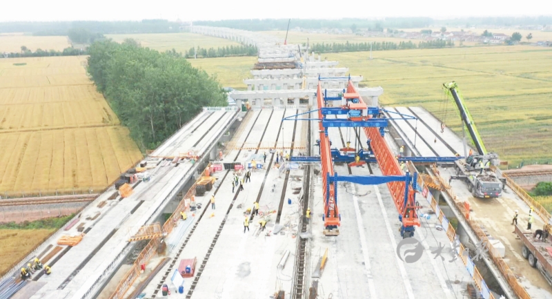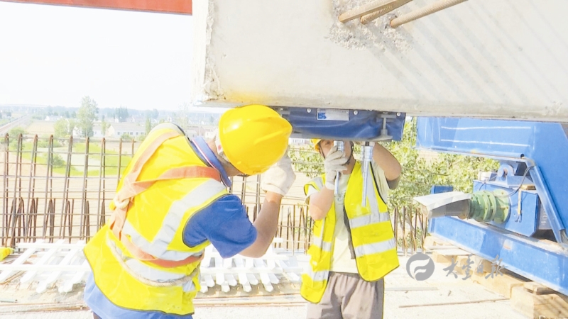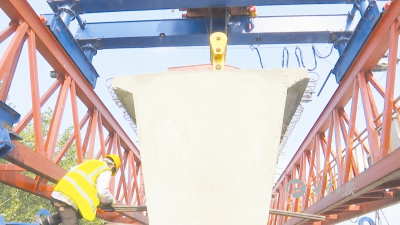 日前,记者在盐丰快速通道二期上跨新长铁路立交工程项目现场看到,硕大的架梁机已在十几米高的桥面处架设完毕,现场几十名施工人员各司其职,反复检查核对。经过1个小时的紧张施工,一片长40米、宽2.4米、重达163吨的预制箱梁安全、平稳、精准地吊装至预定位置,经过现场校对、调整、灌浆等工序后,箱梁架设工作顺利完成。这标志着盐丰快速通道二期工程项目建设取得突破性进展。