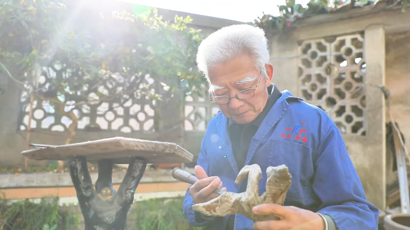 2020年,万盈根雕被列入盐城市第五批市级非物质文化遗产代表性项目名录,在自然形态的树根中获取创作的灵感,将树根自然元素与木雕技艺相融合,所雕刻出来的根雕艺术品称为根雕。很多千姿百态、妙趣横生的根雕作品,均出自根雕艺人冯永年老先生之手,他如痴如醉耕耘在根雕世界里60余载,追求着根雕技艺与传承,每一刀,每一凿都是对自然的敬畏与艺术的追求。