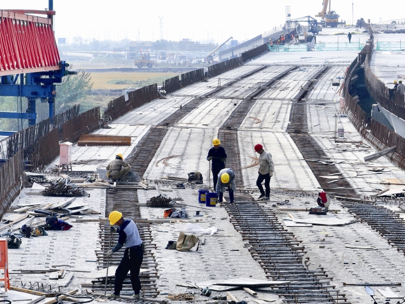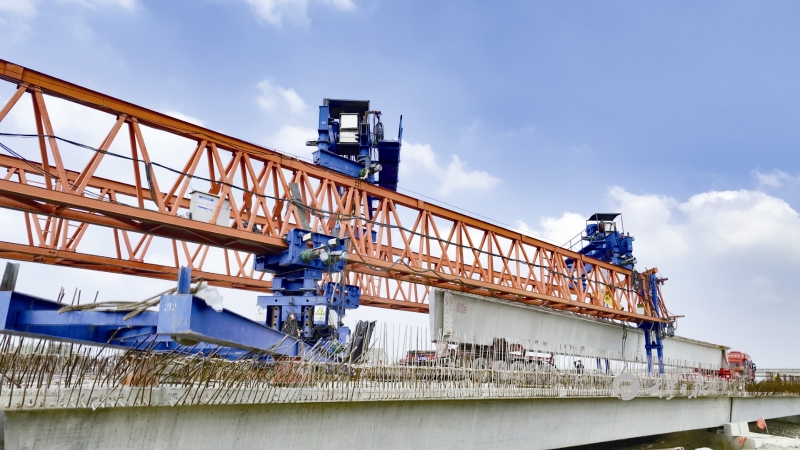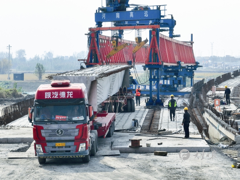 盐丰快速路施工现场正在进行架梁作业