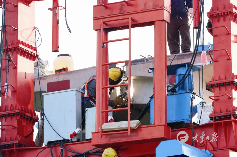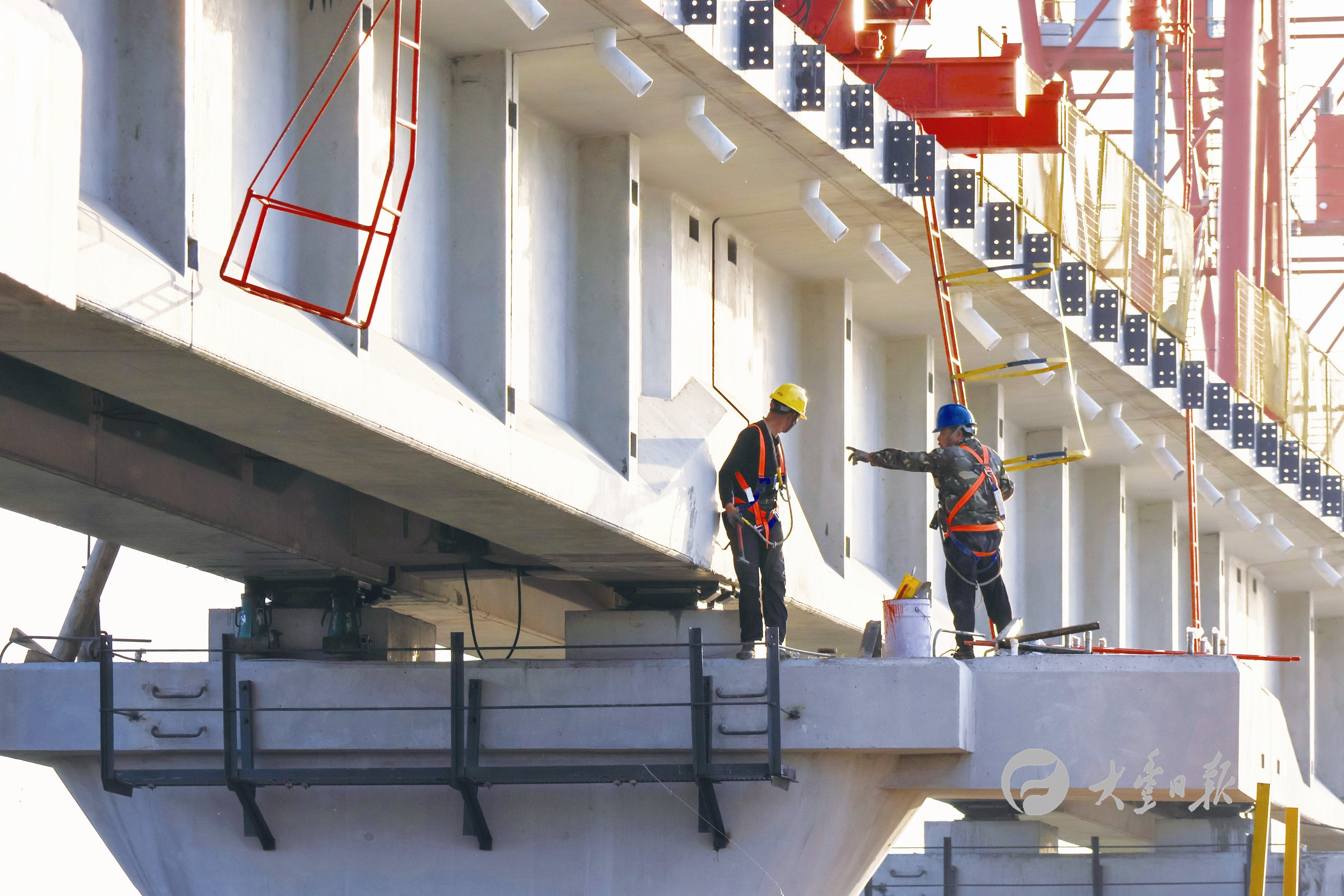 近日,在大丰港铁路支线2号桥机架梁现场,施工人员开始向东架设T梁,将与大里程端1号桥机共同进行桥梁架设。