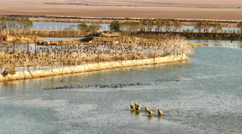 如今,野鹿荡水草丰茂,成片的芦苇湿地映入眼帘,千头野放麋鹿繁衍生息,食野之苹,怡然自得。每年有2万多只候鸟经停过境,候鸟时而在天空中列队飞舞,时而在水面上优雅踱步,与湿地自然风光融为一体。200多公顷的滩涂上,有300多种野生植物种子被收入基因库。一个属于万物生灵的“理想王国”在这里诞生,一幅灵动而又充满生机的生态长卷在这里徐徐开启。