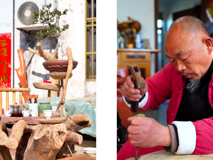 腐根断枝随水流,一生辉煌至此休。幸遇惜才痴雕客,枯木逢春再千秋。这首诗是对我国民间传统根雕艺术的生动诠释。根雕艺术是一种将自然之美与人类智慧巧妙结合的艺术形式,它以树根为原料,通过艺术家的巧手雕琢,展现出千变万化的形态。在小海镇也有这样一位“痴雕客”,名叫周金国,他的根雕茶台制作技艺远近闻名,今天,跟随记者一起去看看吧。