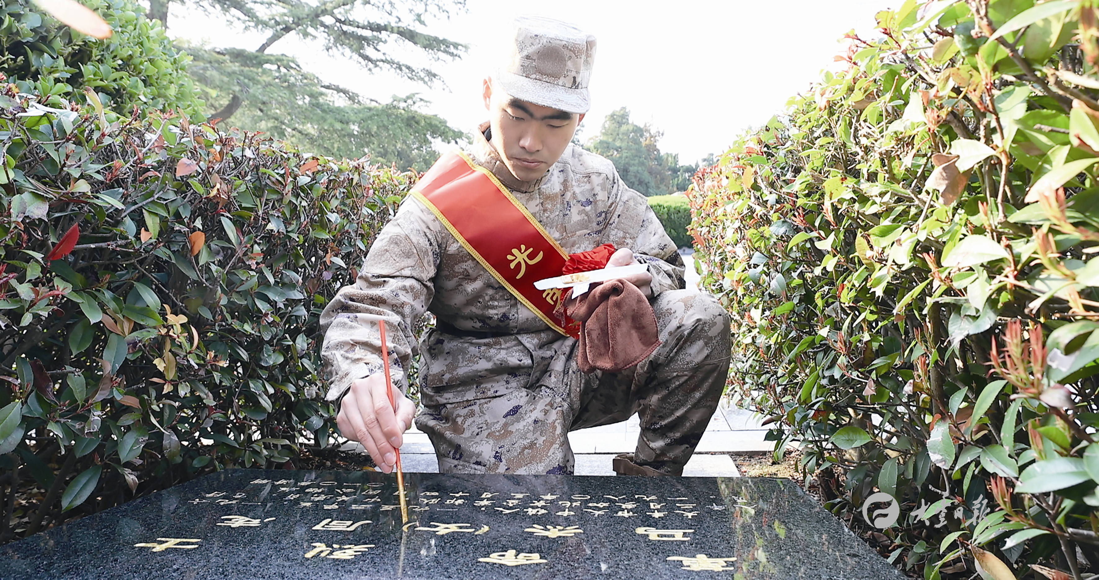 新兵们怀揣着对革命烈士的敬仰之情,在烈士墓碑前仔细端详铭记烈士英名,认真擦拭每一块墓碑,端着颜料拿起毛笔,对每一块烈士的墓碑碑文认真描摹填漆。“执笔描英名”,并不是简单地描摹,每一次擦拭、每一次描红,都是一次精神的洗礼,一笔一画都包含着新兵们对革命烈士的尊重和敬仰,也更加坚定了他们参军入伍的决心和信念。