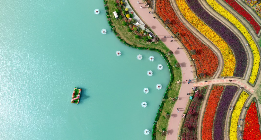花海漫步,天然氧吧里的有氧运动。当300多个品种、3000万株郁金香在晨光中苏醒,蜿蜒的小径便成了最诗意的跑道。沿着天鹅湖畔慢跑,看花瓣在湖面投下涟漪;穿梭于“莫奈花园”的彩虹花境,鼻尖萦绕着荷兰风信子的甜香。景区的“有氧步道”,让你在赏花的同时,不知不觉完成春日减脂计划。