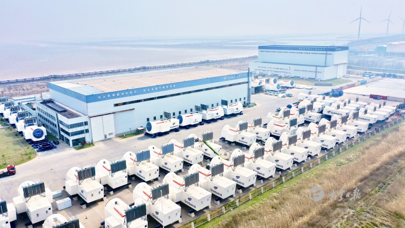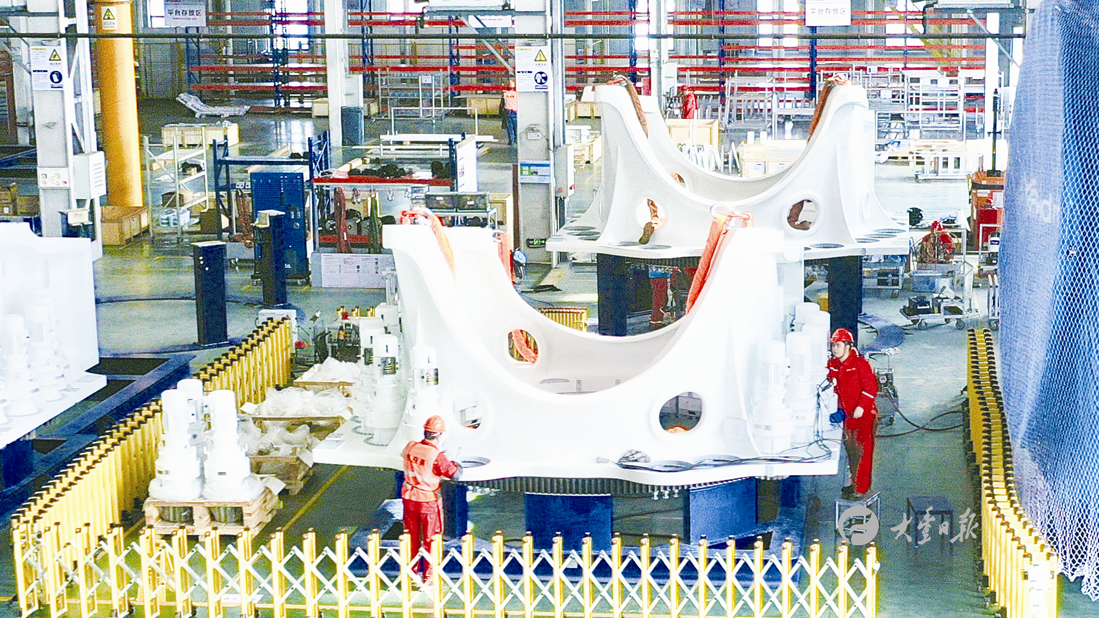 江苏金风科技组装车间车间内,技术人员在安装风电机组。江苏金风科技已发展成为集全系列机组生产、综合试验检测、海上培训服务等为一体的“领跑”企业。目前,该公司已形成“材料、部件、整机、场网、数字孪生”五级实验体系,涵盖叶片工程中心、环境实验室等十大实验室,成为国内研发检测能力最强的海上风电创新平台。