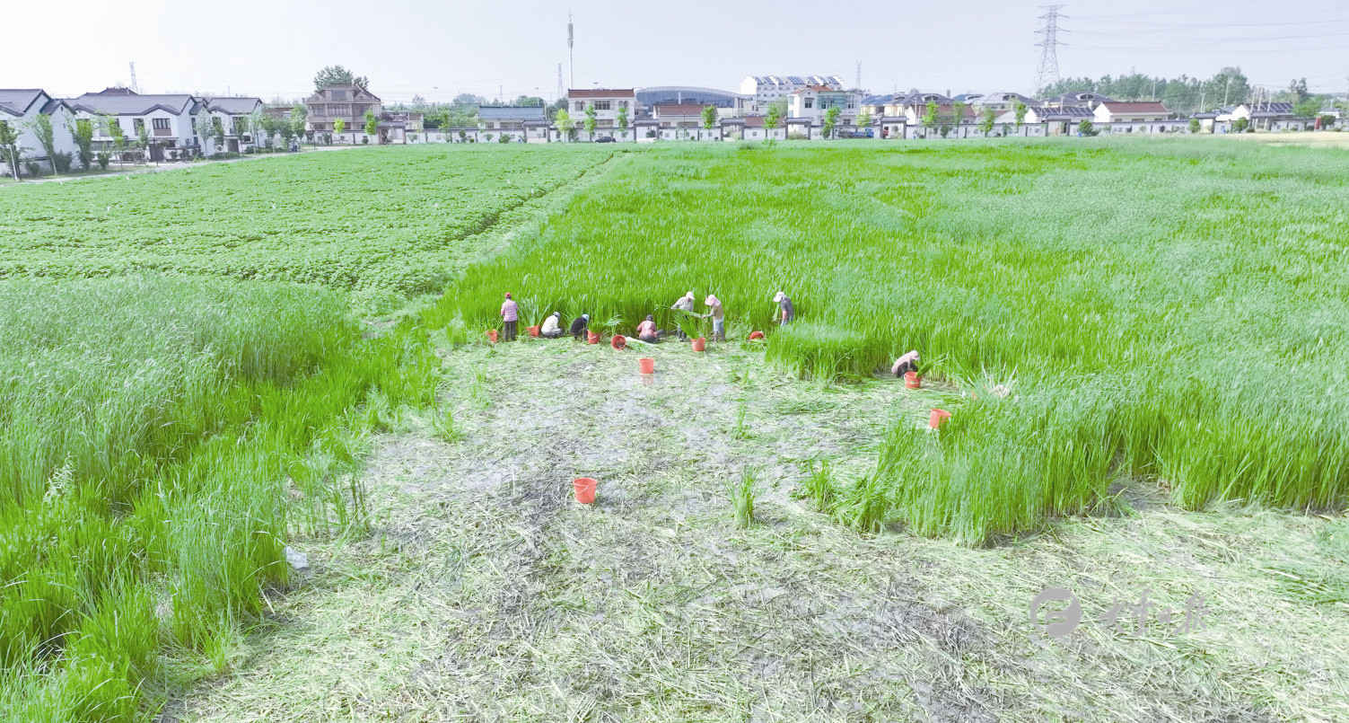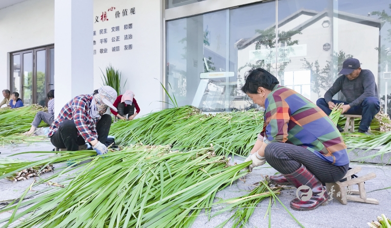 沿着田埂走进去,只见村民们正忙碌着收割菖蒲。他们动作娴熟而利落,一镰刀下去,一丛菖蒲应声而倒。收割后的菖蒲被整齐地堆放在田边,不远处,几位村民正手脚麻利地将菖蒲分拣、打捆。他们一边干活,一边唠着家常,笑声和谈话声此起彼伏。装车点更是热闹非凡,村民们将一捆捆菖蒲搬上车,动作迅速而有序,汗水顺着他们的脸颊滑落,脸上洋溢着丰收的喜悦。该村监委会主任杨国荣说:“我们和周边的花卉市场早就搭好了线,端午节前订单特别多,销售渠道很畅通。今天一天就接了20万株的订单,前几天也陆陆续续发出去十几万株了。这不光让村民的钱包鼓了起来,也让大伙儿更有信心把庭院经济搞下去。”