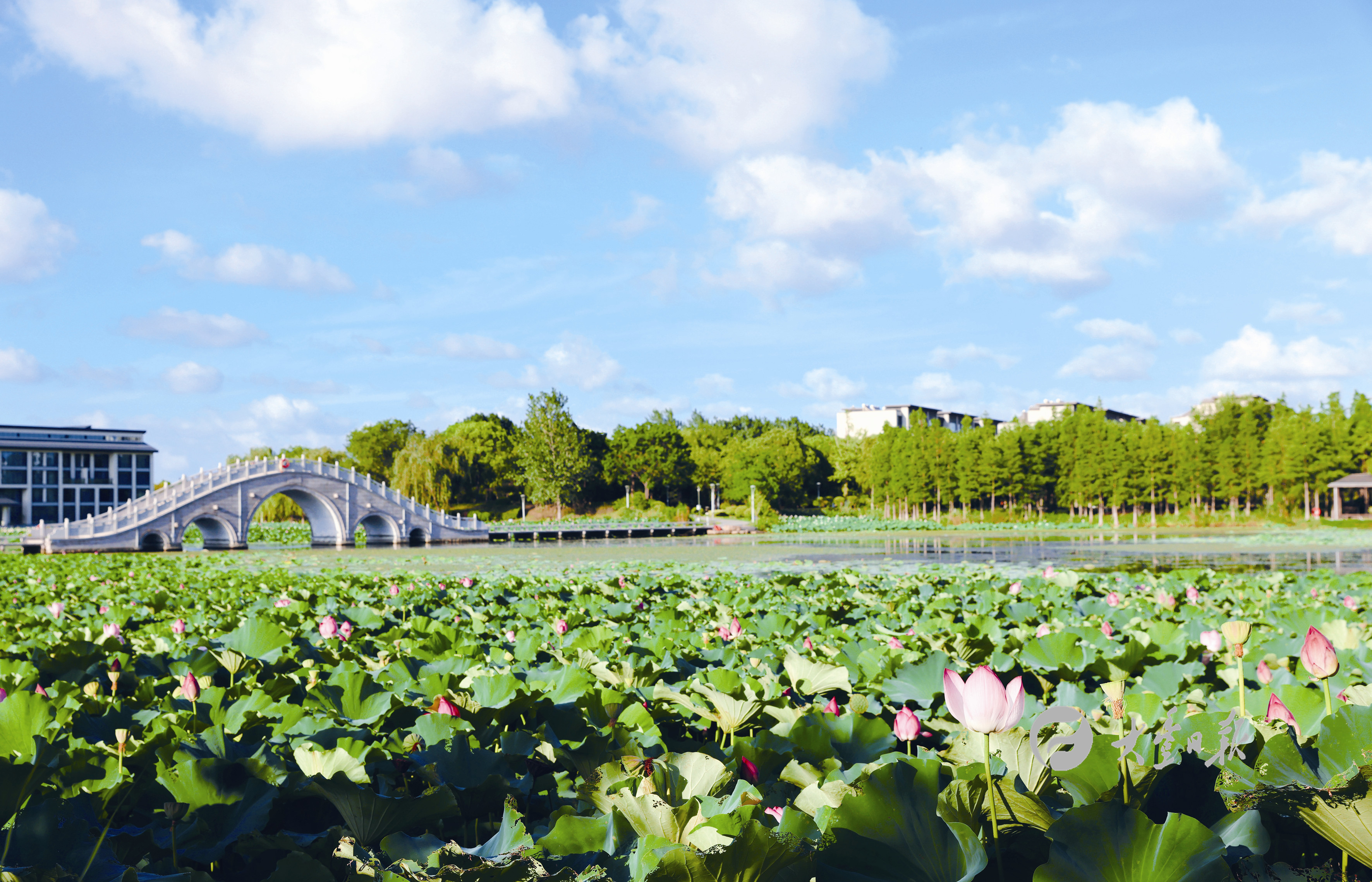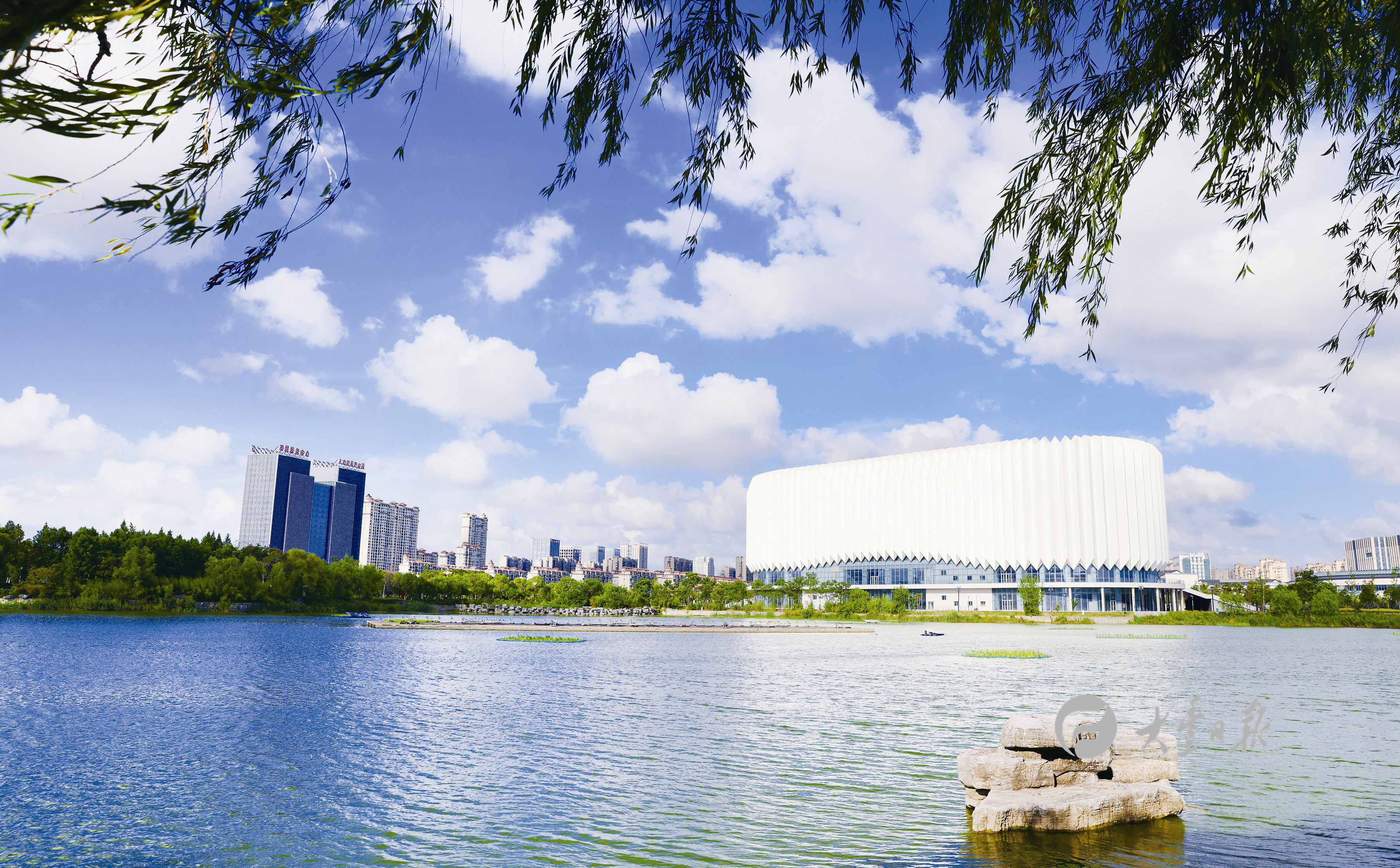 7月23日,城区天空湛蓝澄澈,朵朵白云随风涌动,好似闯入宫崎骏的夏天。近年来,我区持续加强生态环境保护,全力打好蓝天保卫战,空气质量明显改善,优良天数不断刷新,人民群众幸福感、获得感持续增强。图为东郊公园和环湖路会展中心。