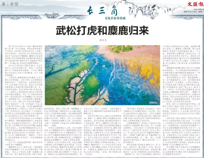日前,《文汇报》专版刊登钟求是创作的《武松打虎和麋鹿归来》,让我们跟随文化名家,在大丰看麋鹿回眸处,读水浒江湖。