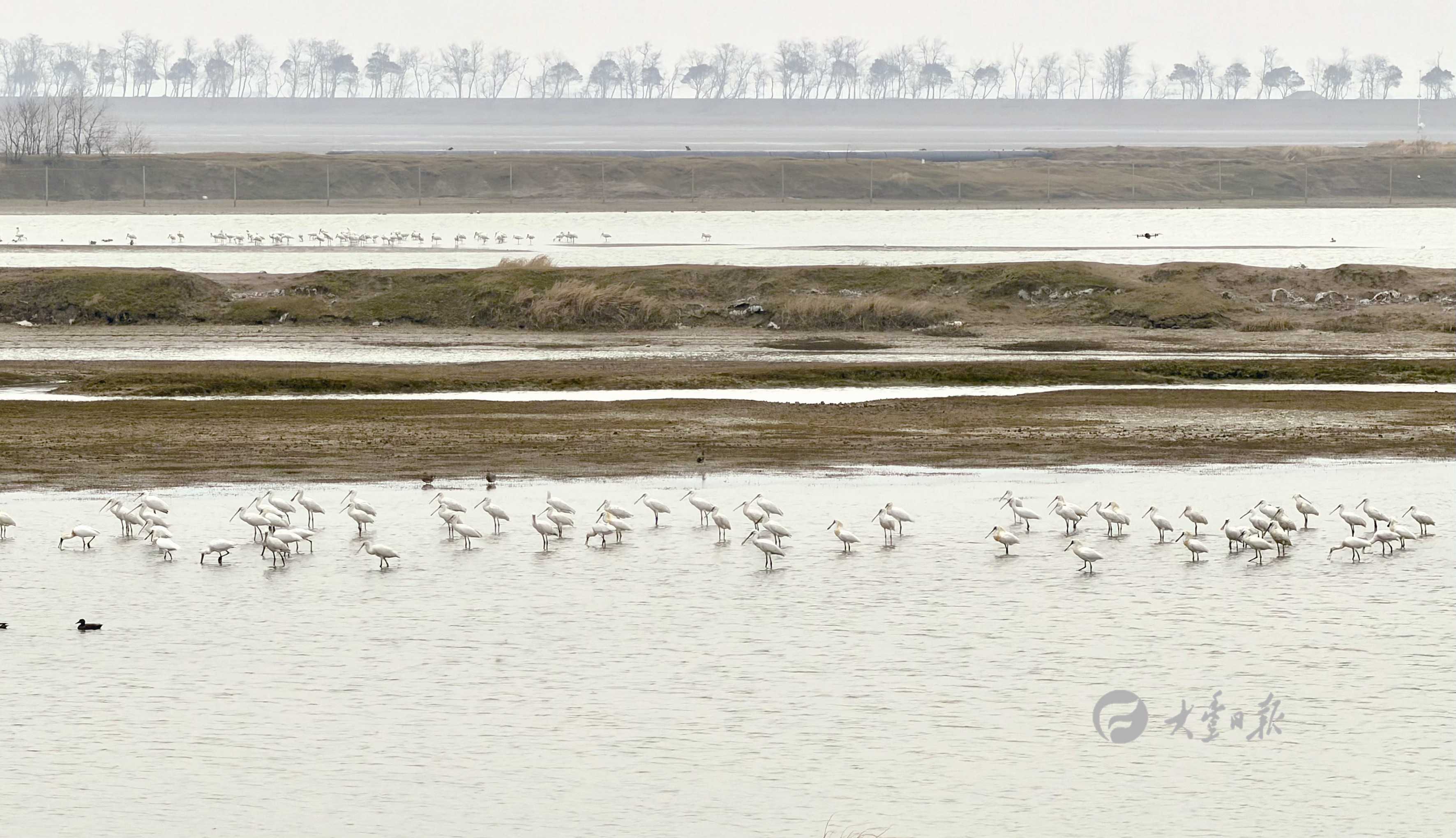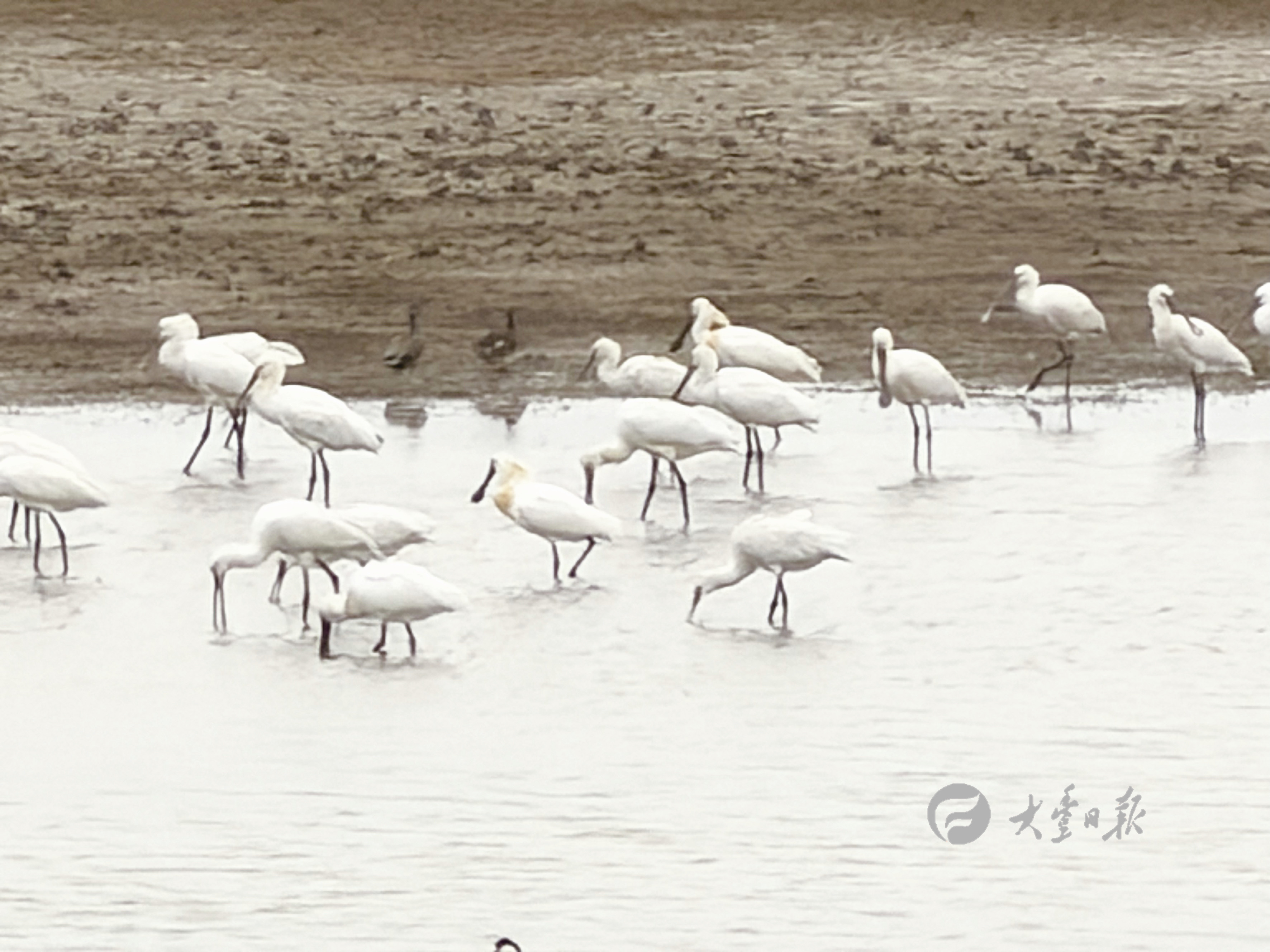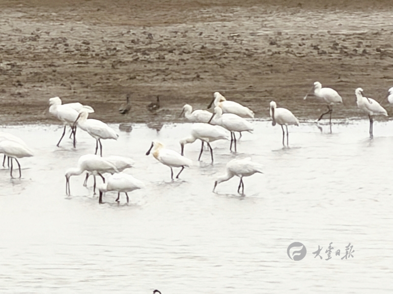 琵鹭结伴觅食尽显湿地生态之美