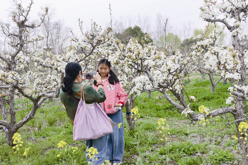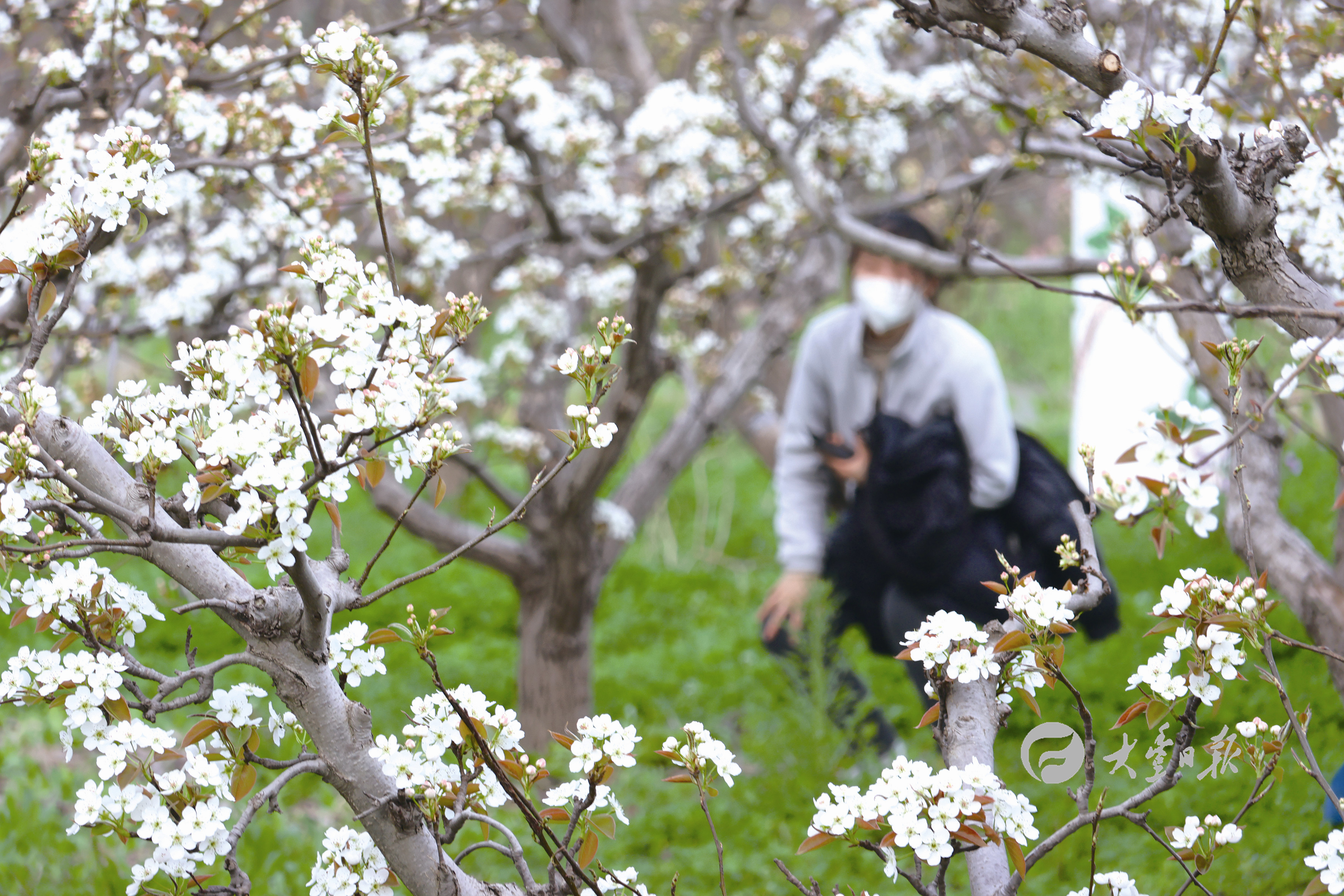 4月2日,大中街道恒北村梨园内,上百株梨树开花,游客前来踏青赏花打卡。